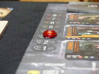 Il y a en permanence trois lieux accessibles. Plus chaque lieu est loin, moins on aura de temps pour l'explorer. Tout cela est symbolisé par un certain nombre de cartes Exploration que l'on pourra retourner. Ces cartes forment le paquet de l'Inconnu, et on aura régulièrement le choix entre voir plus de choses mais faire du bruit, ou être discret et explorer moins.